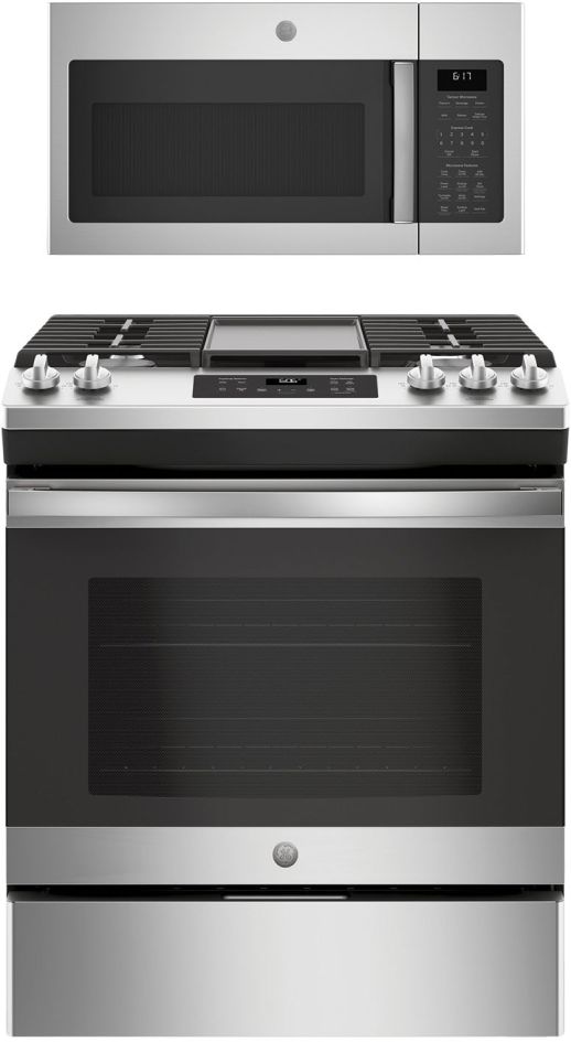 GE® 2 Piece Stainless Steel Kitchen Package with slide in range and over the range microwaveRead More
